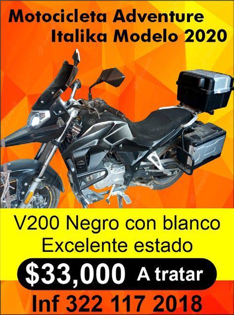 Motocicleta Adventure Italika,´20, V200, negro con blanco, excelente estado $33,000 a tratar. Inf 322 11 720-18.+