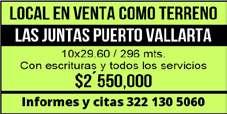 Las Juntas neighborhood, 10x29.60/296 meters , commercial space for sale as land, with deeds, all utilities. $2,550,000. Info and appointments. 322 13 050-60.+