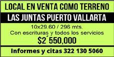 Col. Las Juntas, 10x29.60/296 mts., premises for sale as land, with deeds, all services. $2’550,000. Inf. and appointments. 322 13 050- 60.+