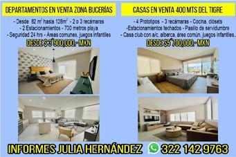 Departamentos en venta desde 82 M2 hasta 128 M2, 2 0 3 Rec., 2 estacionamientos, seguridad 24 hrs. Desde $3´900,000 mxn. Inf. 322 14 297-63.+