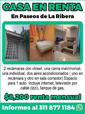 Fraccionamiento Izamal, 2 Rec., semi amueblada, a/a toda la casa, 1.5 baños, alberca, seguridad, cochera 1 auto. $11,500. Inf. 322 31 867-50.+