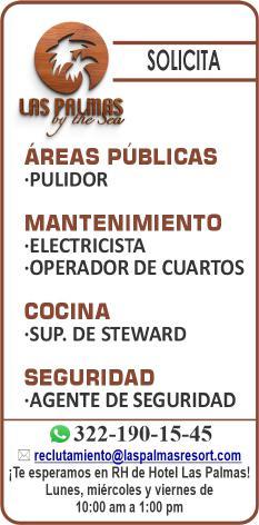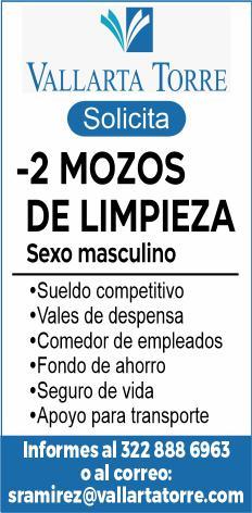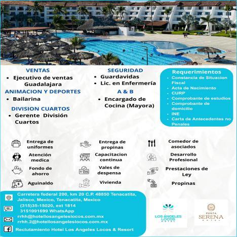 Solicitamos ayudante de cocina, jardinero/machetero, auxiliar de limpieza, recepcionista. Ofrecemos apoyo de transporco. Inf. 322 20 379-12.+