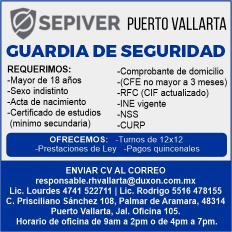 seguridad para muelles de la marina, ambos sexos, ingles básico, experiencia en el puesto, disponibilidad de horario. Inf. 322 22 103-95.+