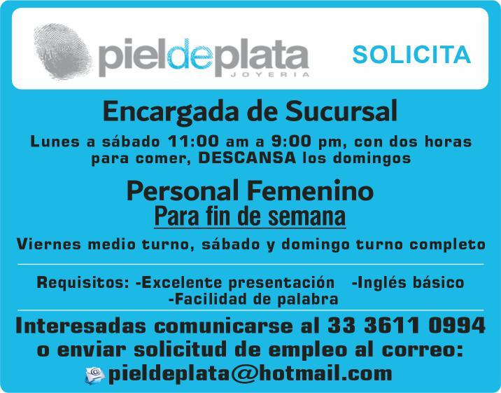 Solicito: Encargada de sucursal, inglés básico, excelente presentación. Inf. pieldeplata@ hotmail.com. 333 61 109-94.+