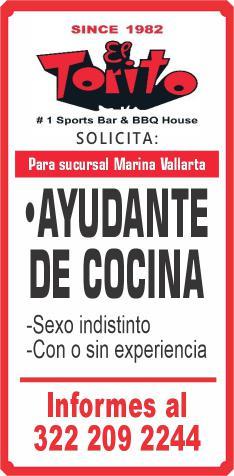 Se solicita cocinero B para desayunos, de 7 am a 3 pm. Citas al. 322 22 105-60, 322 22 108-