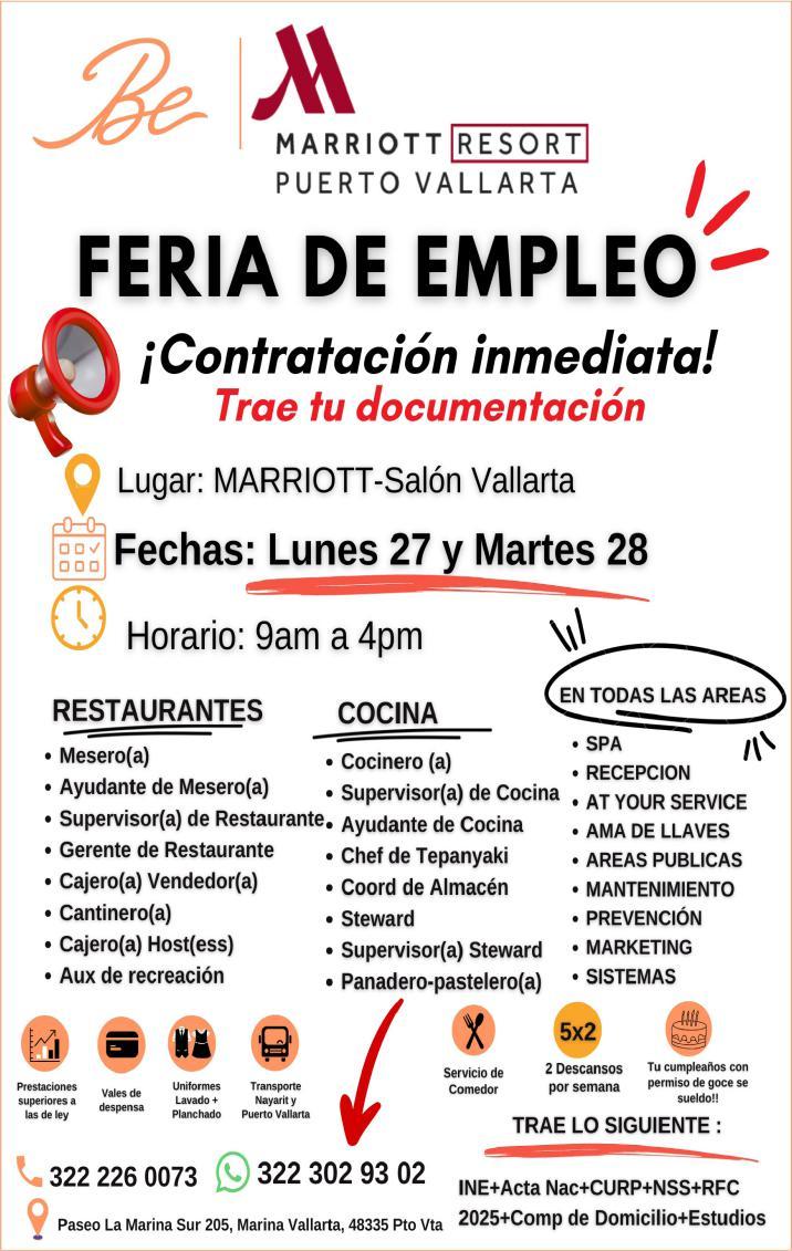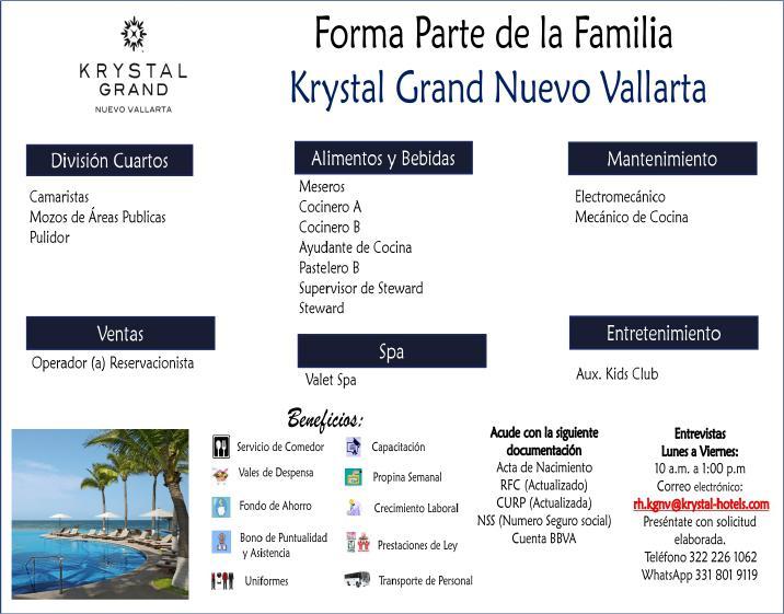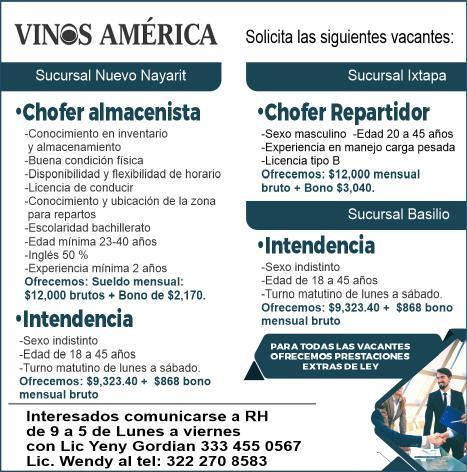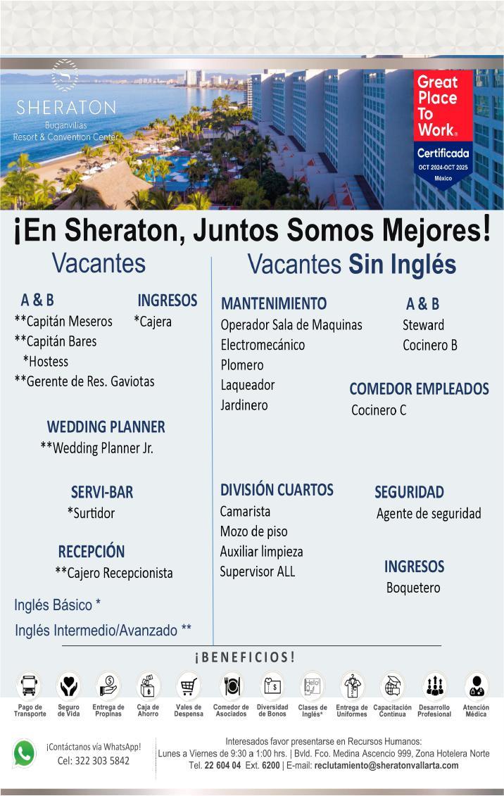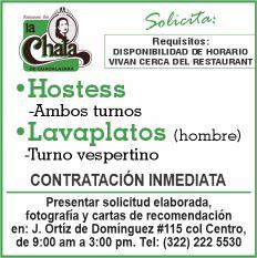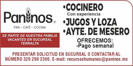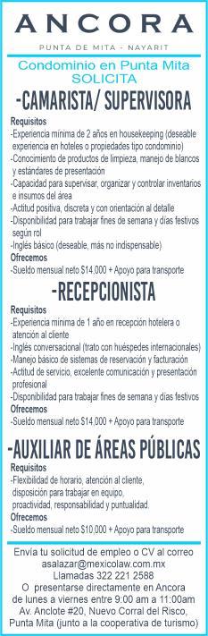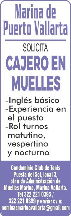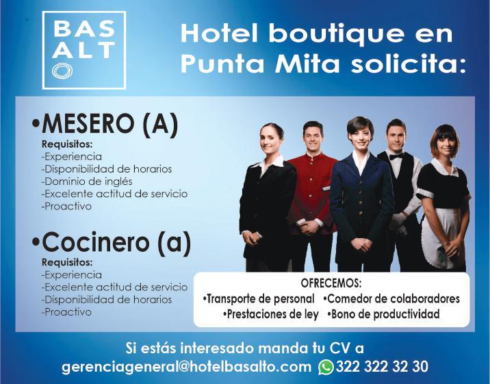 básico, conocimiento en open table, cocinero B y ayudante de mesero citas al. 322 22 105-60, 322 22 108-71.+