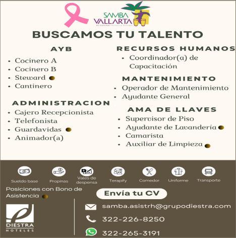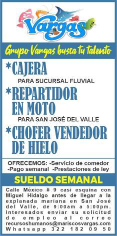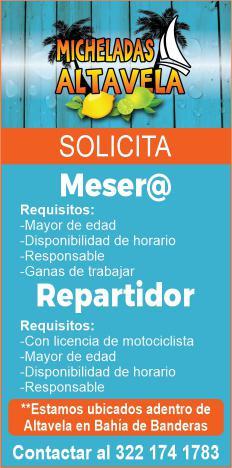Se solicita cajera con inglés básico, conocimiento en open table, cocinero B y ayudante de mesero citas al. 322 22 105-60, 322 22 108-71.+