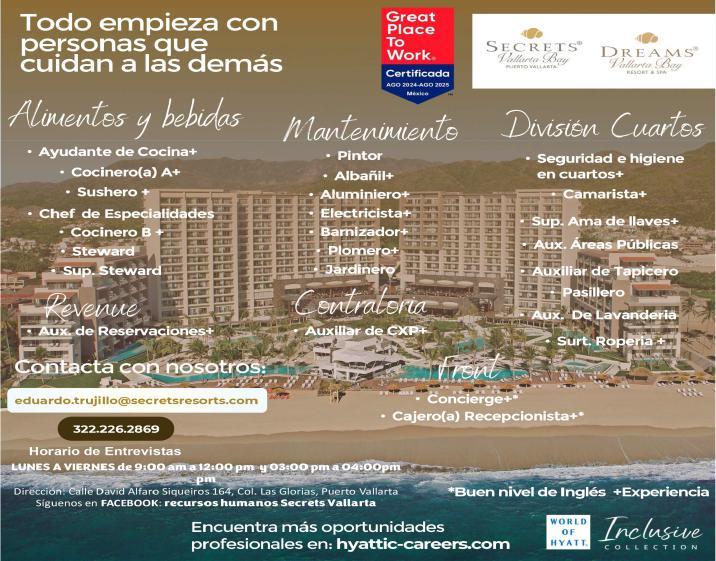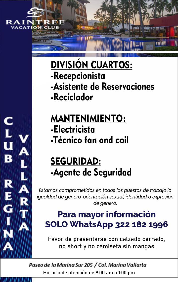 Importante hotel solicita Agente de Seguridad, Recepcionista y Mozo de Limpieza, estamos general. Informes WhatsApp. 322 14 552-99.+