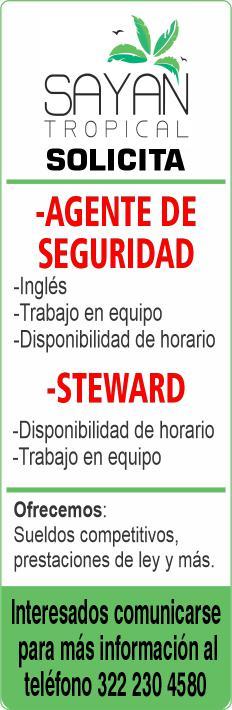 Área de Nuevo Vallarta, solicitamos agente de seguridad nocturno, ayudante de mantenimiento, mesero, pizzero y steward. Presentar solicitud elaborada. Inf. 322 29 704-03.+