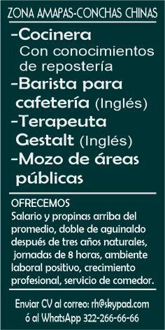 Área Conchas Chinas, se busca Cocinera (experiencia en repostería), Barista para cafetería (inglés), Terapeuta Gestalt (inglés), Mozo de áreas públicas. 322 26 666-66.+