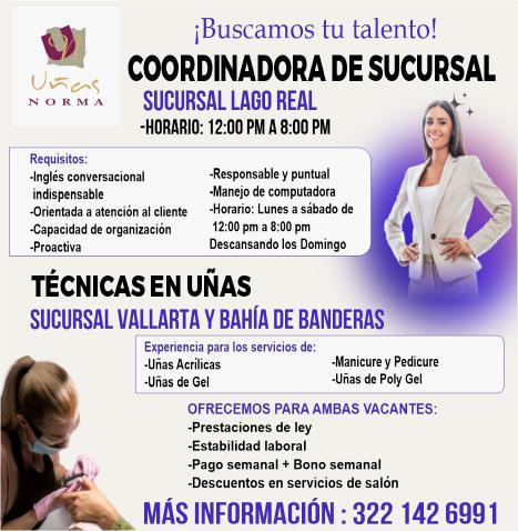 Solicito técnicas en uñas con experiencia, excelente atención al cliente. Informes. 322 15 86723.+