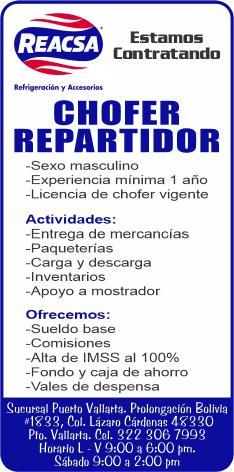 Chofer repartidor, con licencia, sexo masculino. Inf. 322 30 171-63.+