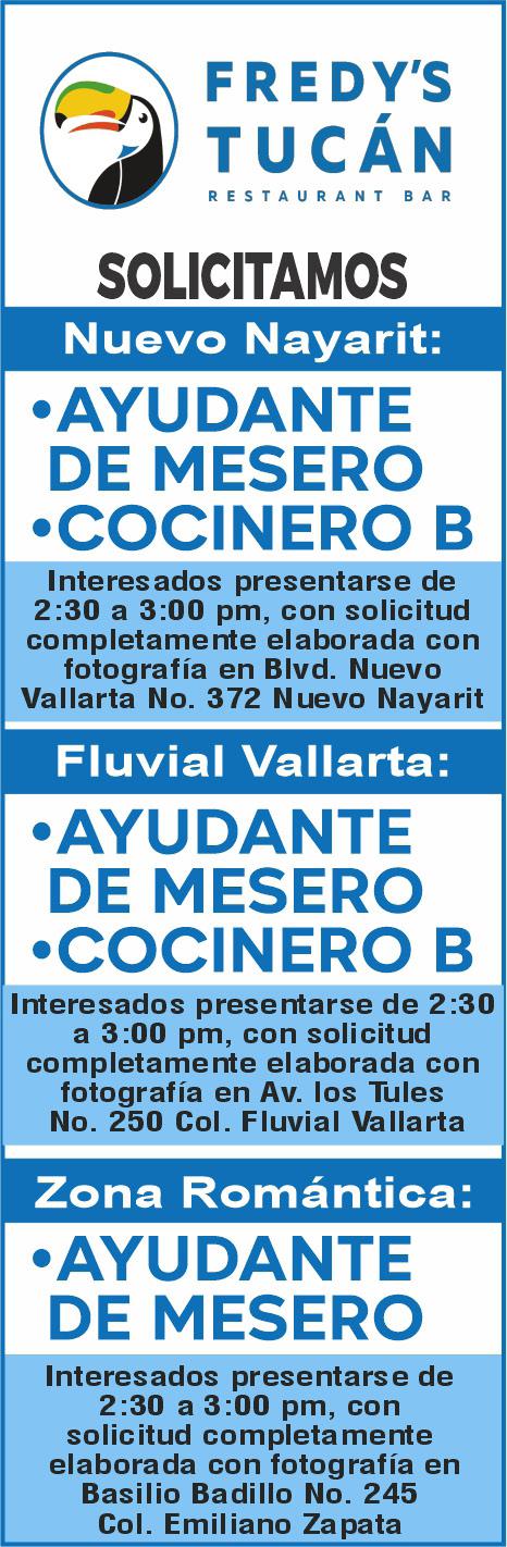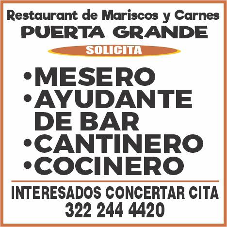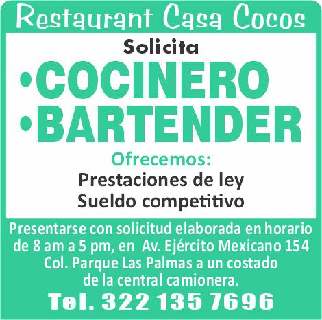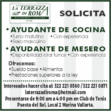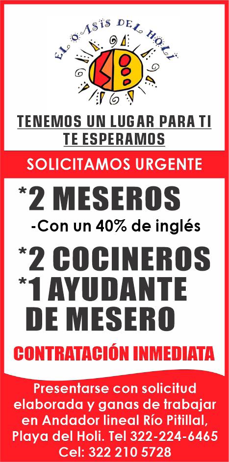 Se solicita ayudante de mesero y ayudante de cocina. Citas al. 322 22 105-60, 322 22 108-71.+