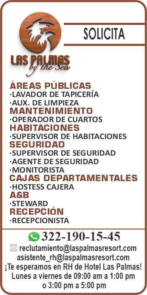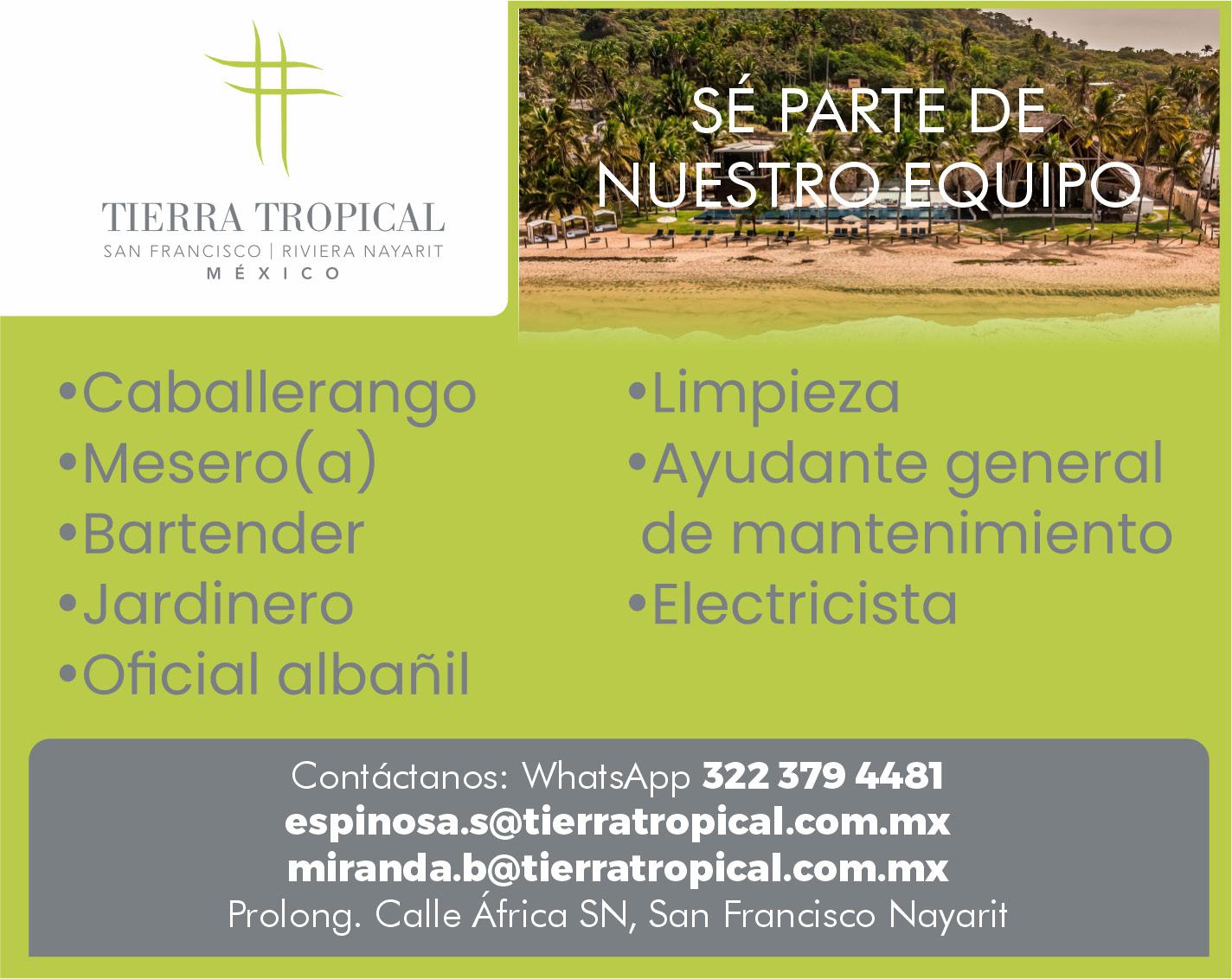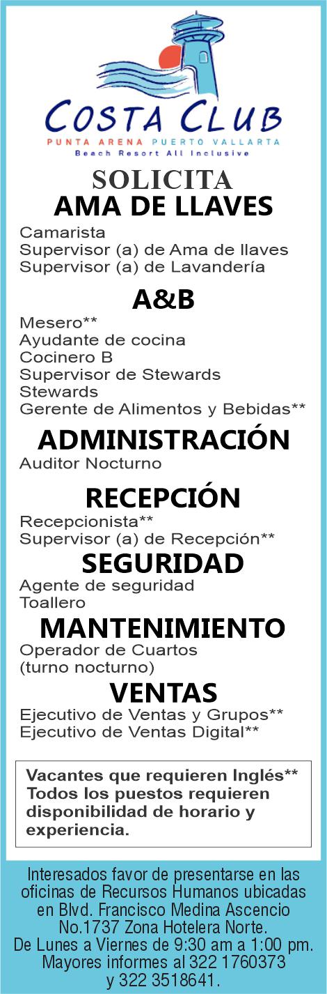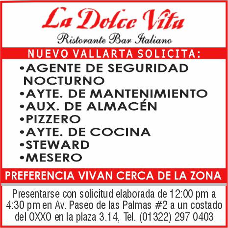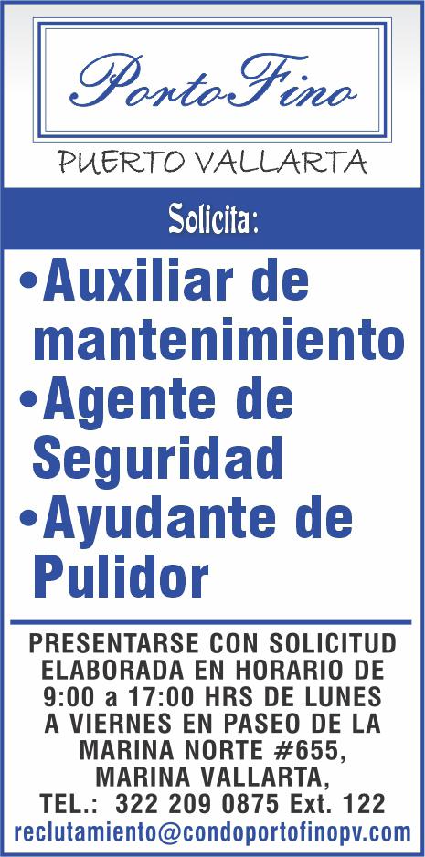 Área de Nuevo Vallarta, solicitamos agente de seguridad nocturno, ayudante de mantenimiento, pizzero, steward, mesero. Presentar solicitud elaborada. Inf. 322 29 704-03.+