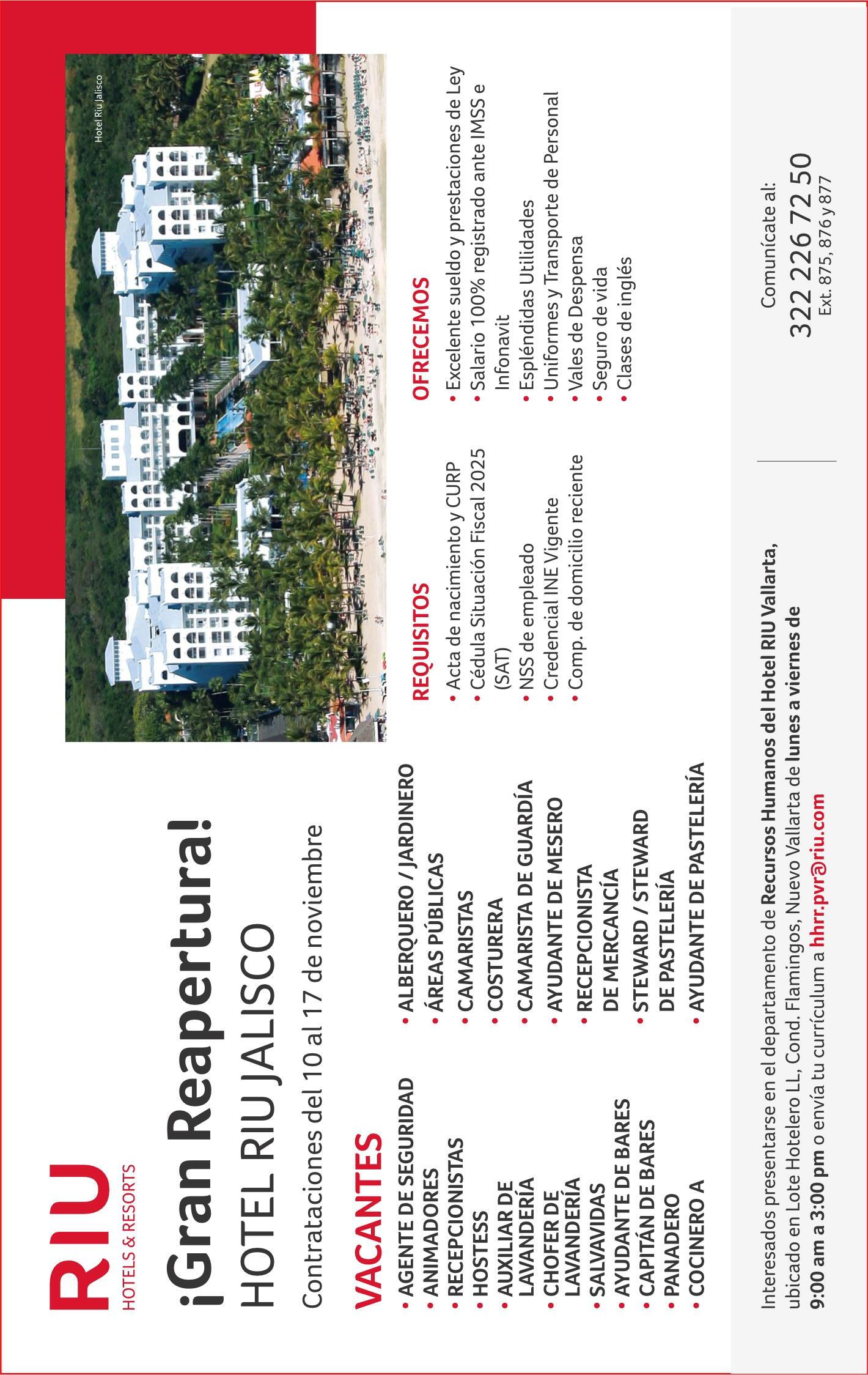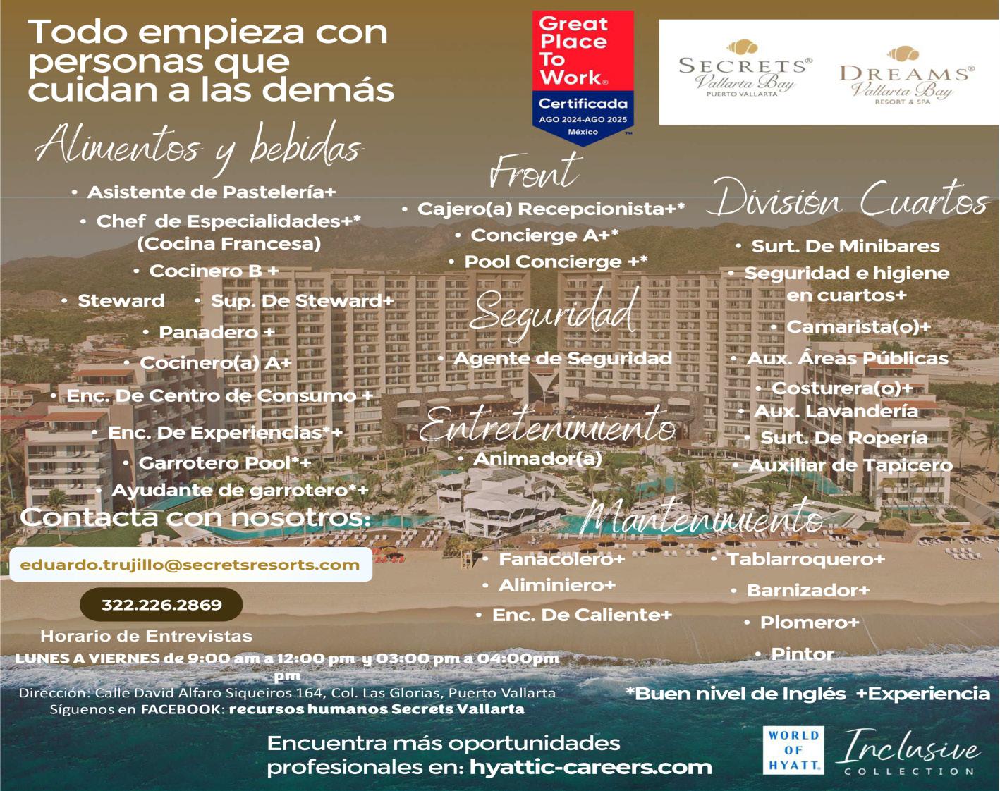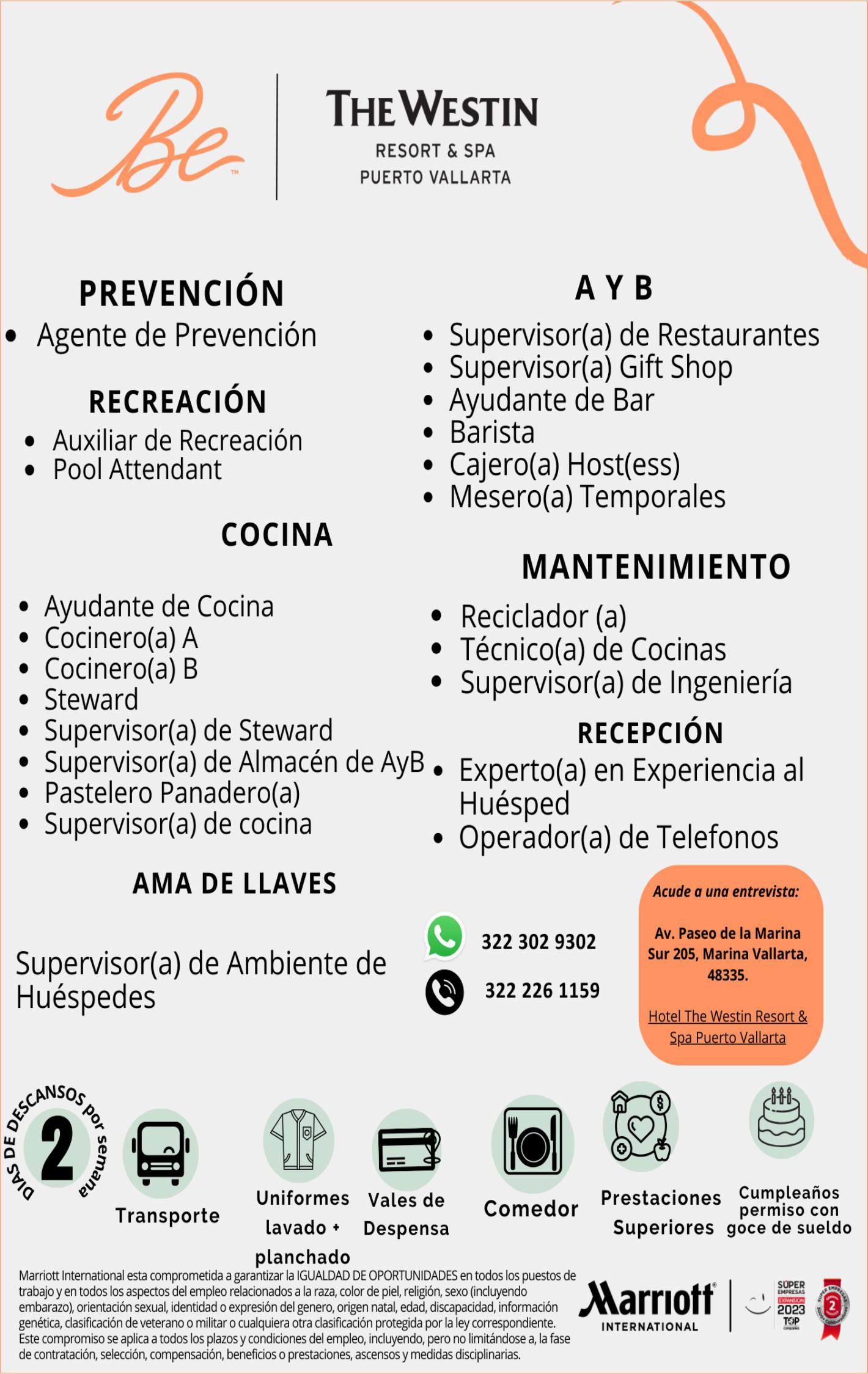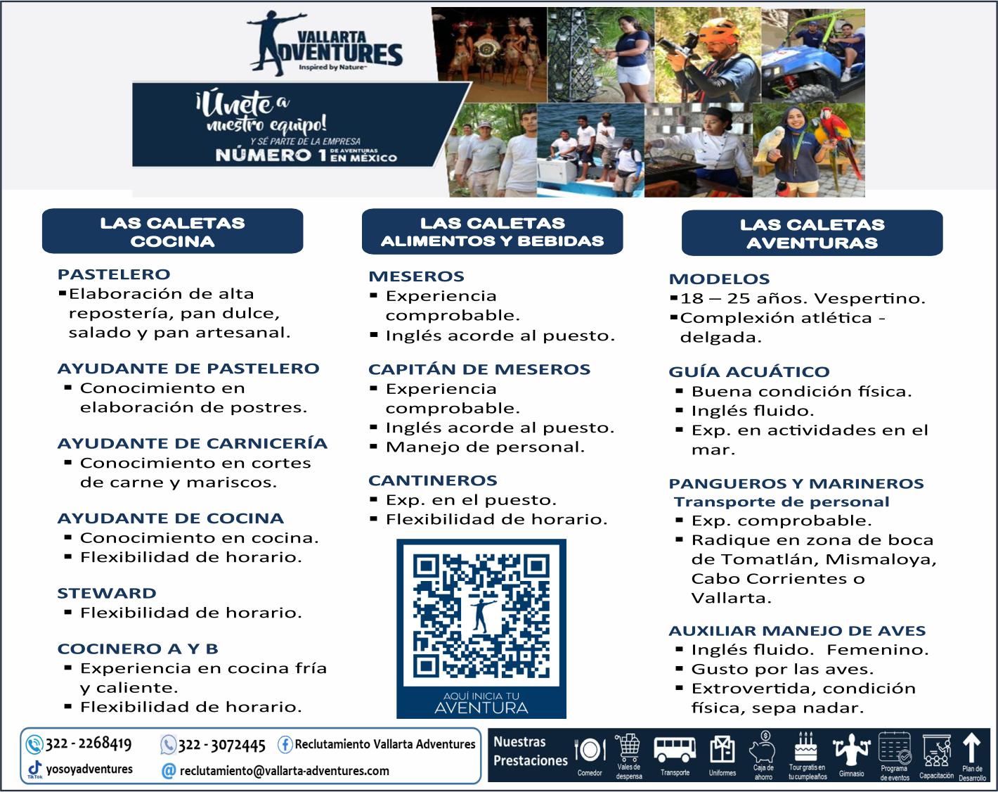 Únete a nuestro equipo como Cocinero, Ayudante de cocina, Auxiliar de limpieza informes experiencia, licencia de chofer vigente. Inf. 322 28 126-05.+