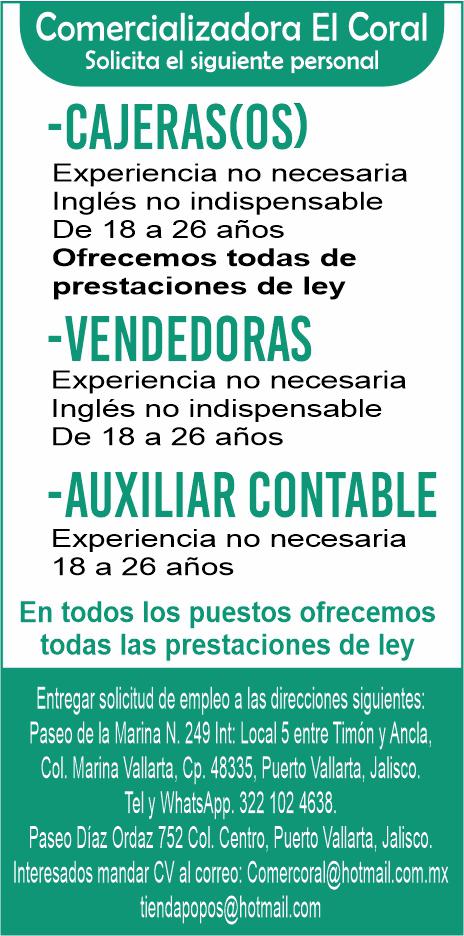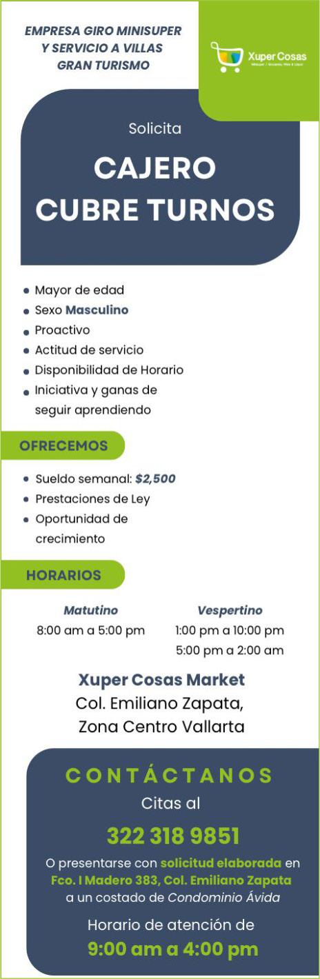 Solicitamos Cajero cubre turnos. Postúlate al. 322 31 89851.+