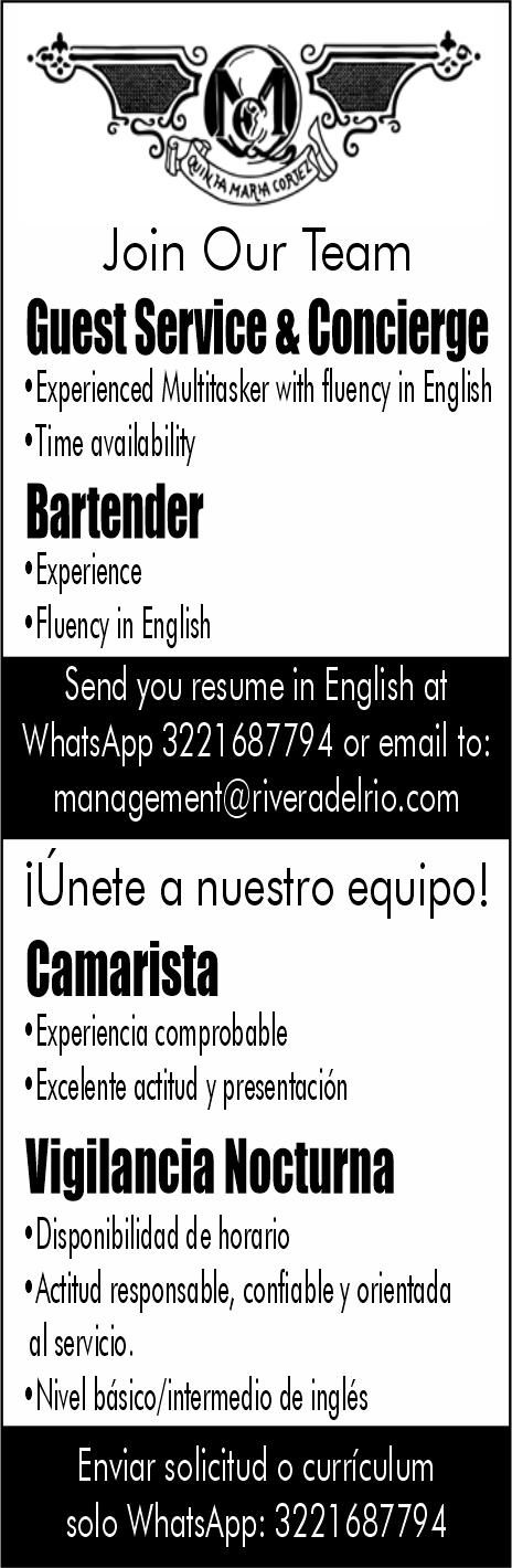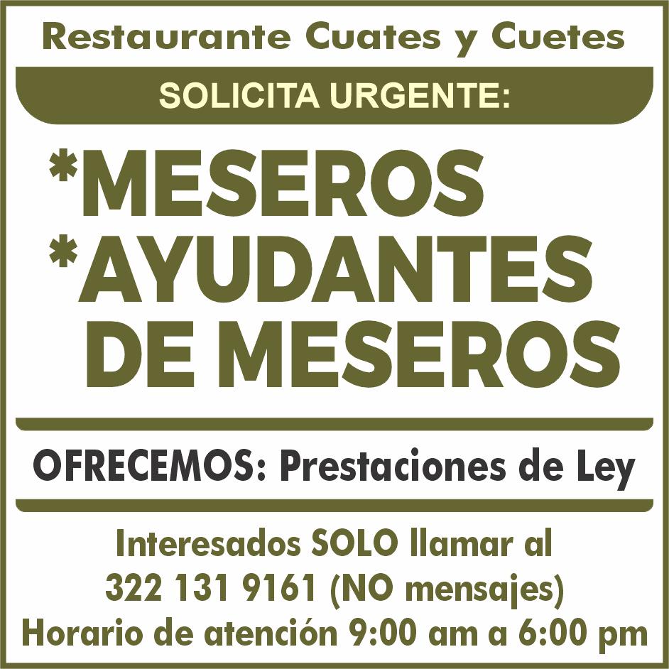 Se solicita urgentes meseros, ayudantes de meseros, solo llamadas de 9:00 am a 6:00 pm, no mensajes al. 322 13 19161.+