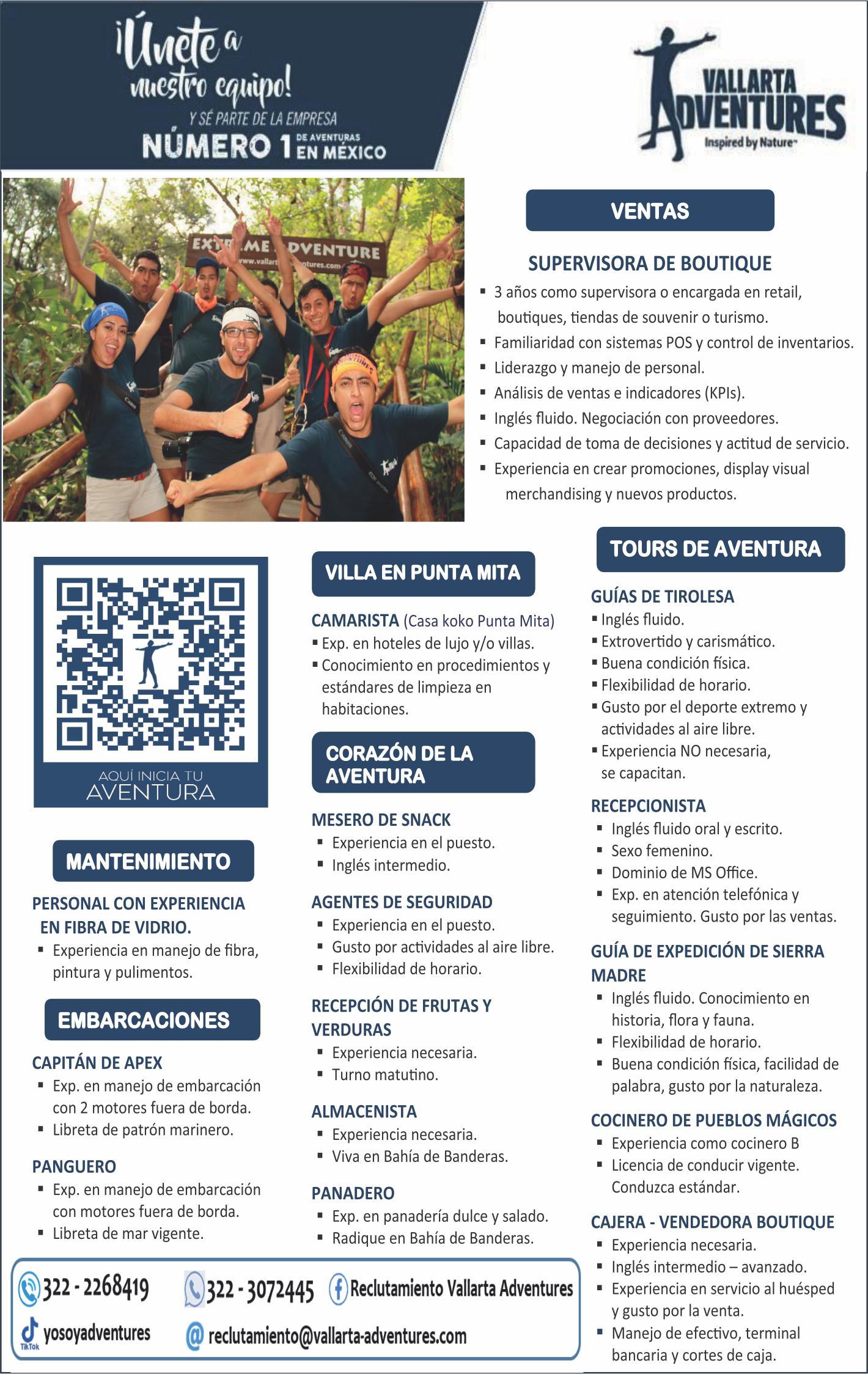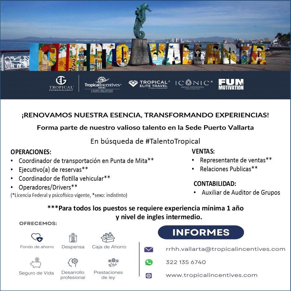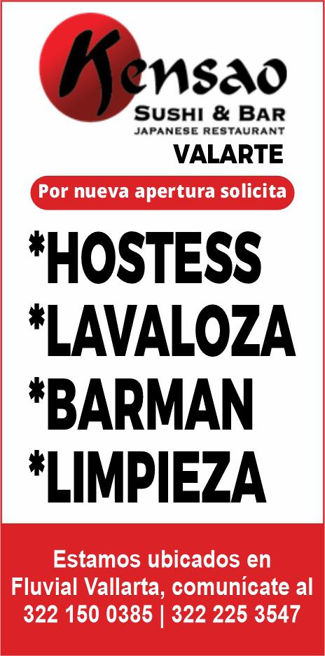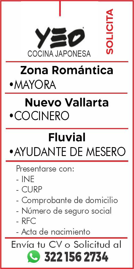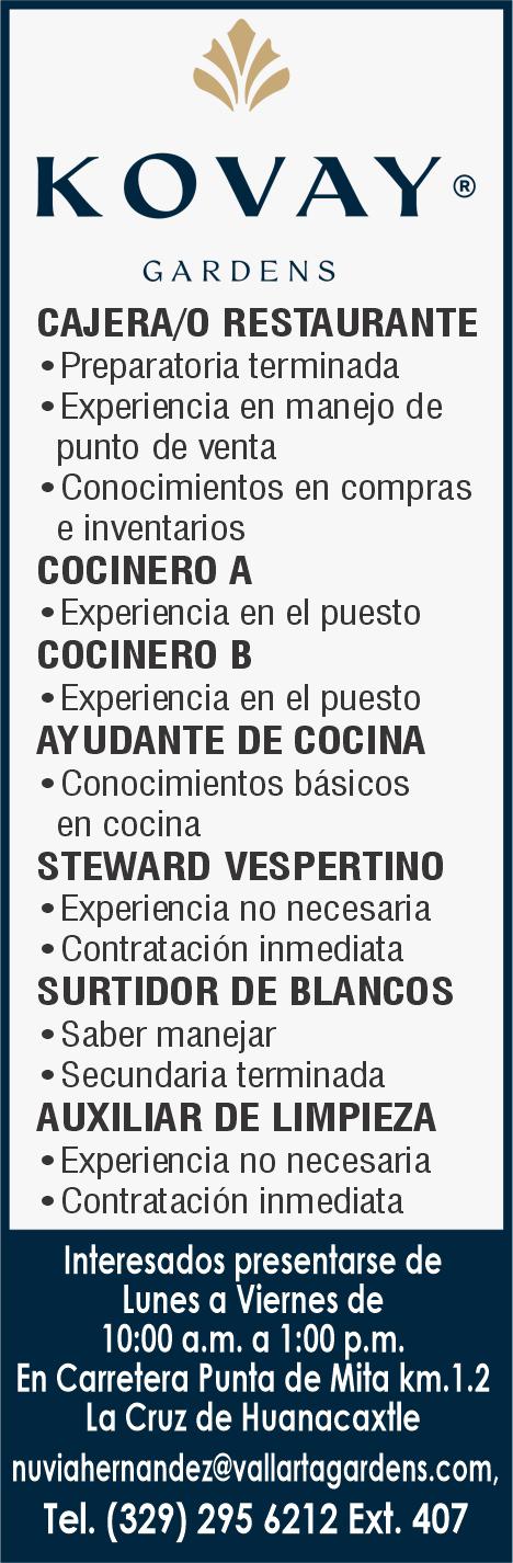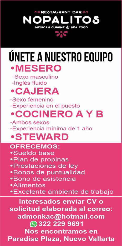 Buscamos cocineros con experiencia, hostess con buena presentación, mesero con disponibilidad de horario. Inf. 322 22 309-28, 322 22 309-29.+