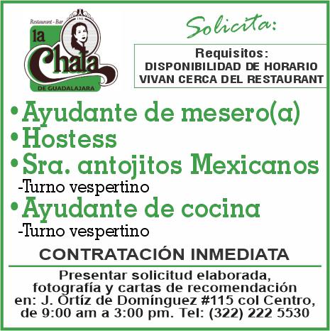 mos ayudante de mesera, sexo femenino, edad 18 a 25 años, excelente presentación, cocinera de 25 a 40 años, experiencia. Inf. 322 29 404-17.+