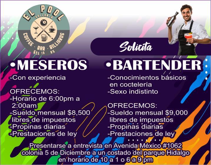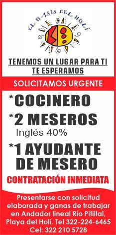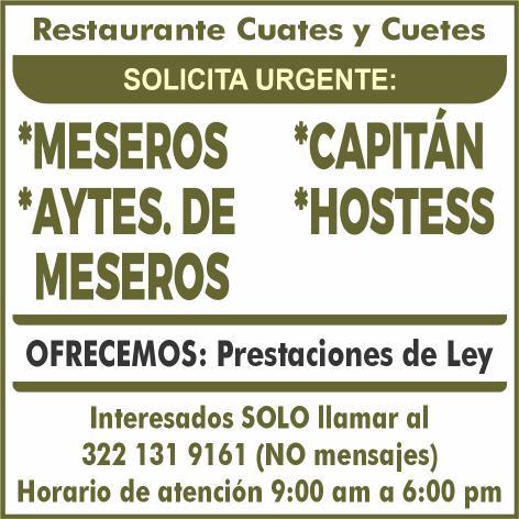 Se solicitan urgentes meseros, ayudantes de meseros, capitán y hostess. Solo llamadas de 9:00 am a 6:00 pm, no mensajes al. 322 13 191-61.+