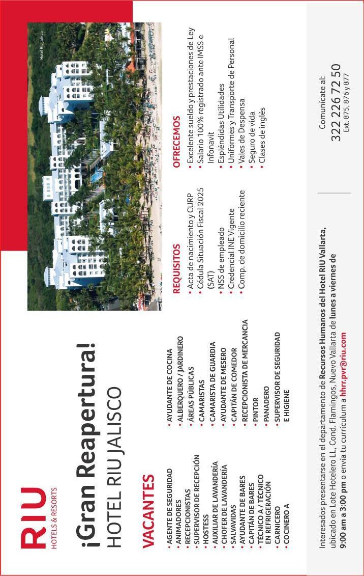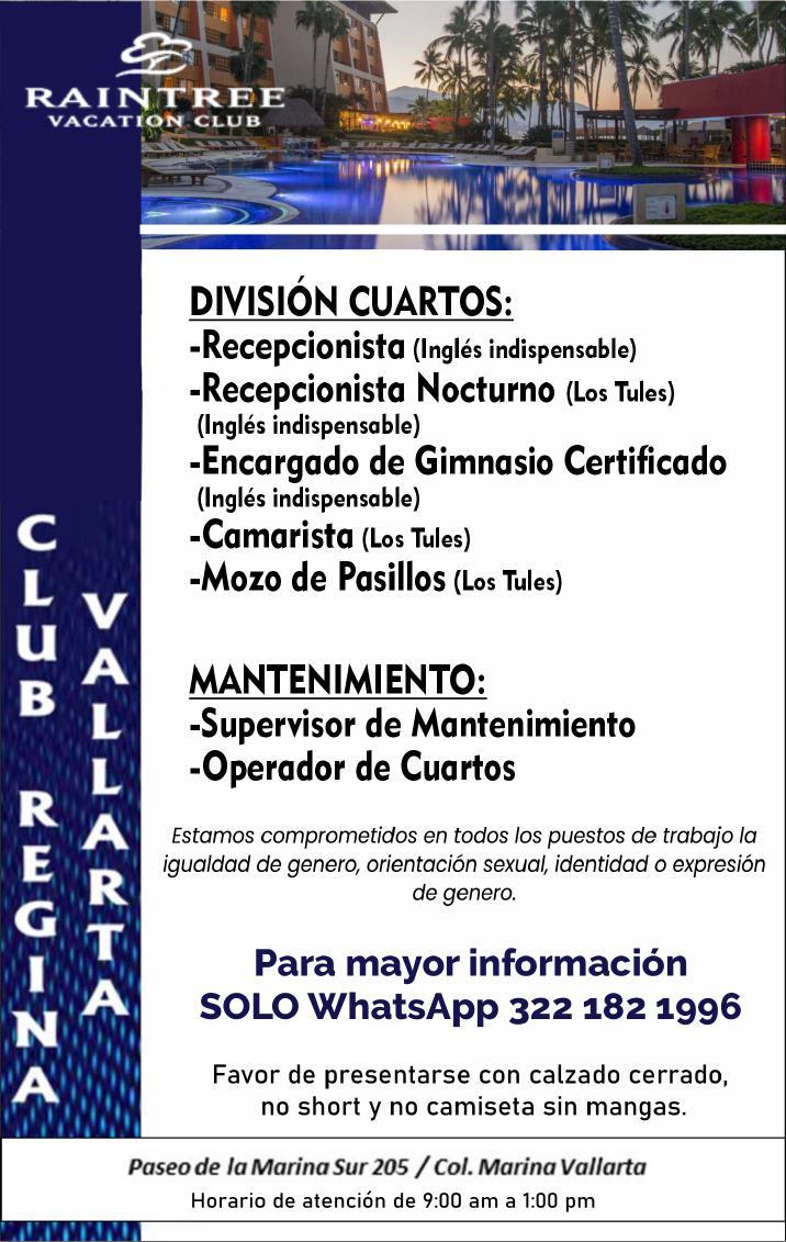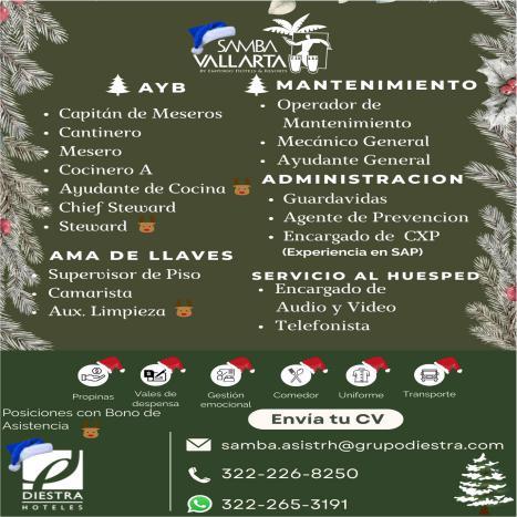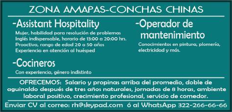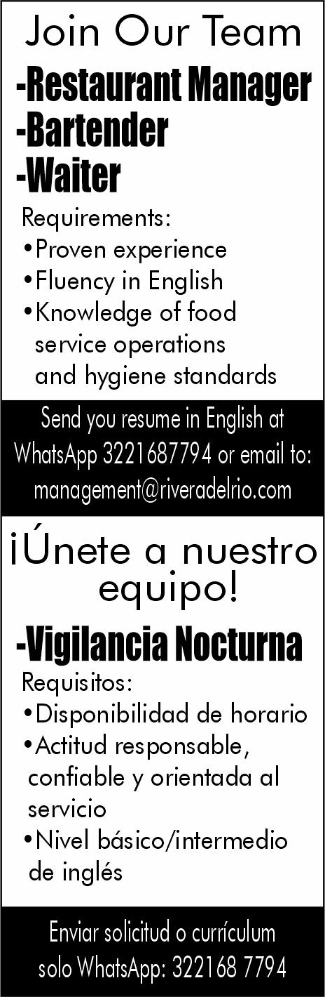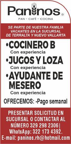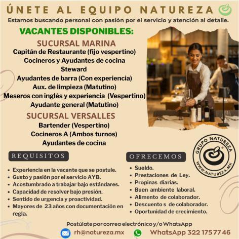 ayudantes de meseros, capitán y hostess. Solo llamadas de 9:00 am a 6:00 pm, no mensajes al. 322 13 191-61.+