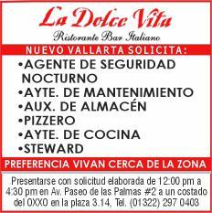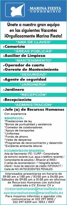 Área de Nuevo Vallarta, solicitamos agente de seguridad nocturno, ayudante de mantenimiento, pizzero, steward, me-