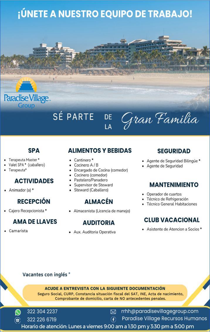 Área de Nuevo Vallarta, solicitamos agente de seguridad nocturno, ayudante de mantenimiento, pizzero, steward, mesero, presentar solicitud elaborada. Inf. 322 29 704-03.+