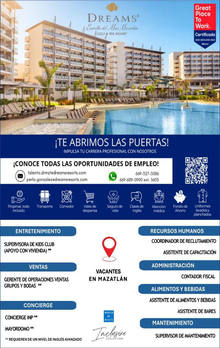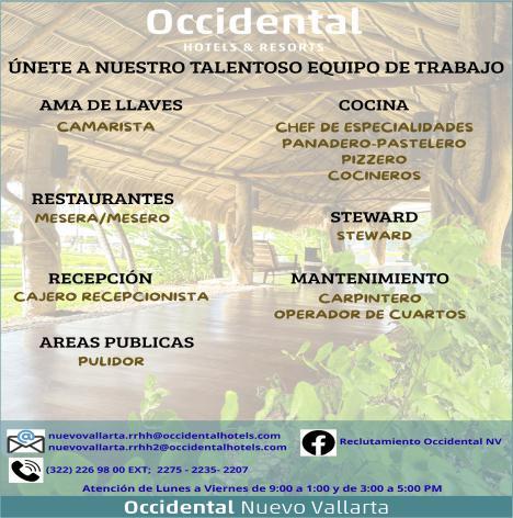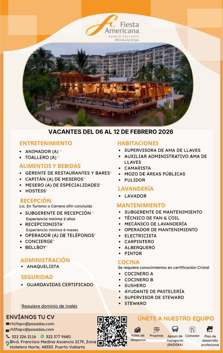 Estamos en busca del siguiente personal: Auxiliar de Costos e Inventarios, Mesero, Guía de Turistas, Camarista, Electromecánico Vespertino, Ayudante de Cocina. Informes al. 329 29 562-12, Ext. 407.+