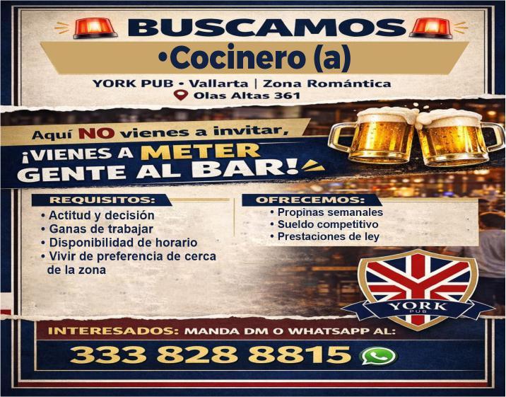 Buscamos cocineros B con experiencia, hostess con buena presentación, mesero con disponibilidad de horario. Inf. 322 22 309-28, 322 22 309-29.+