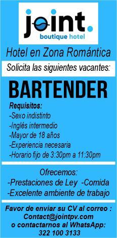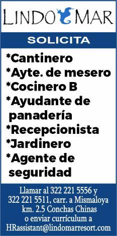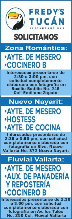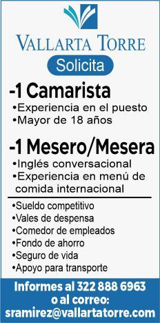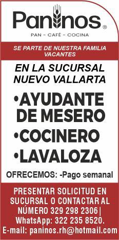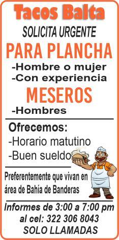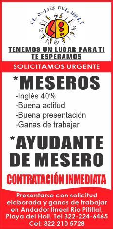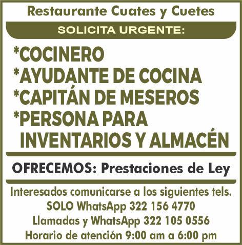 Se solicitan urgentes meseros, ayudantes de meseros, ayte. de bar, ayte. de cocina, cocinero, solo llamadas de 9:00 am a 6:00 pm, no mensajes al. 322 13 191-61.+