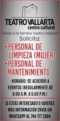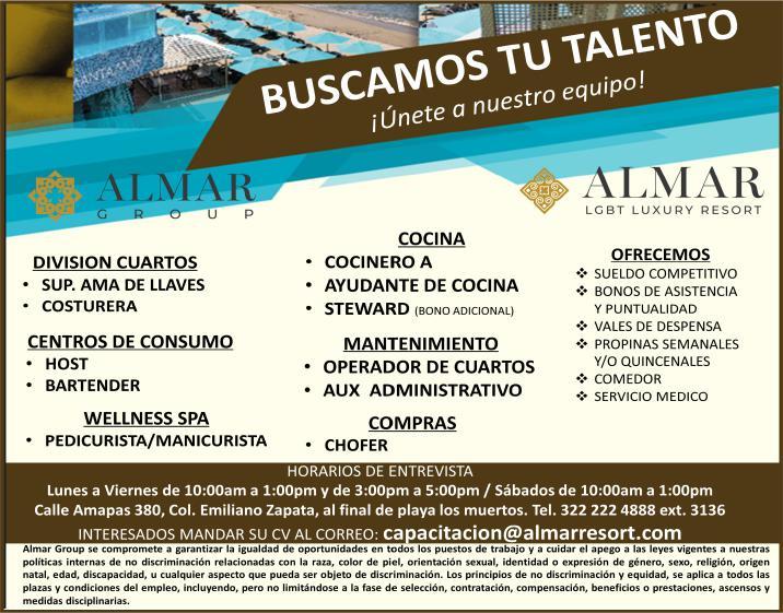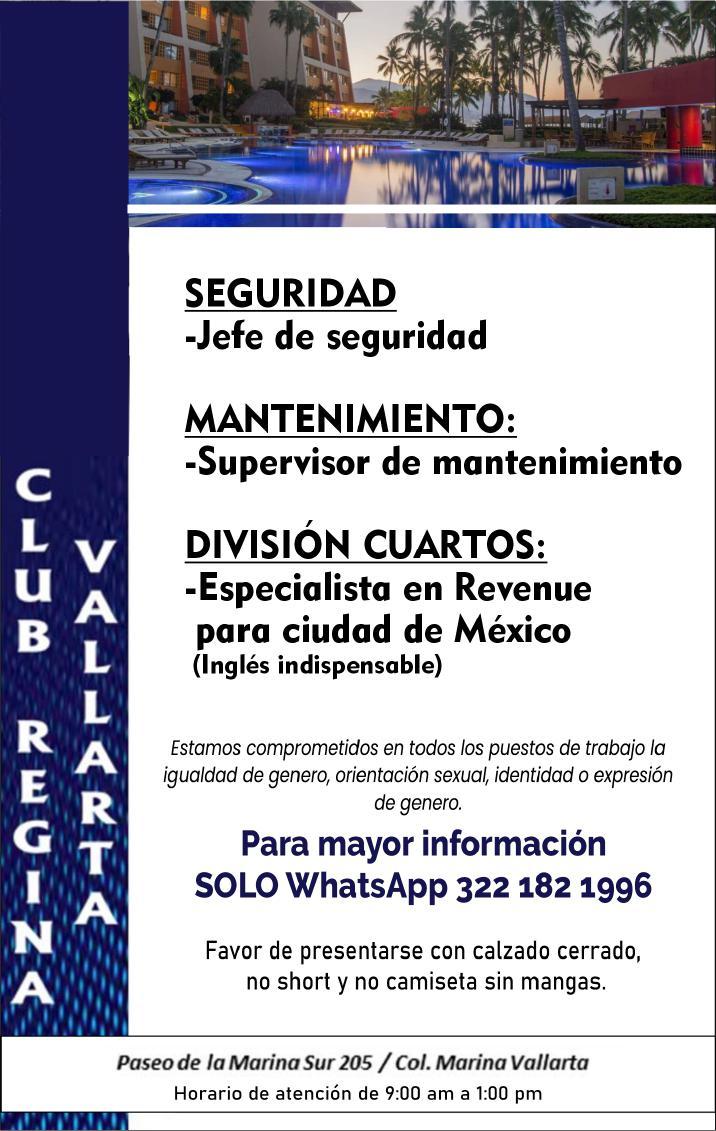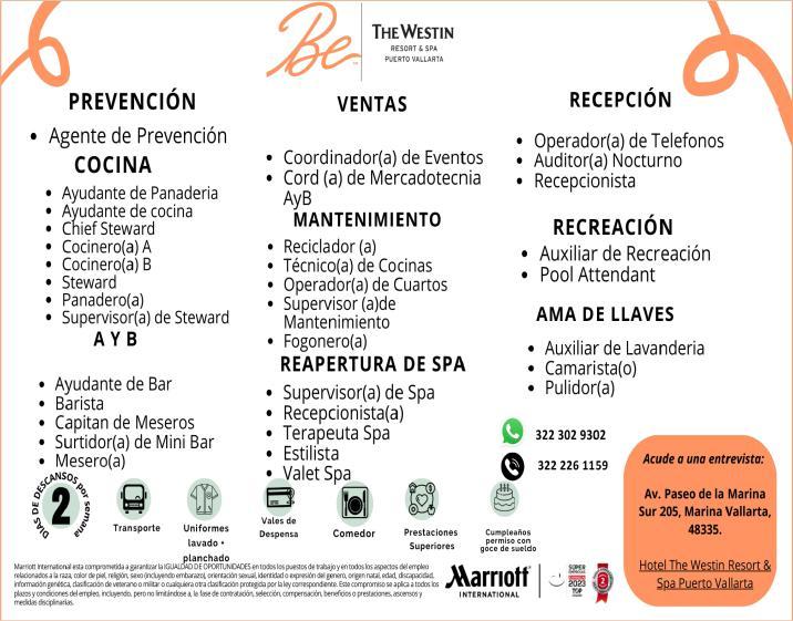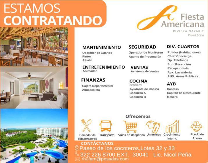 Estamos solicitando el siguiente personal: Jardinero, Operador de Cuartos, Cocinero B, Tenis Pro, Escenógrafo, Recepcionista, Vendedor de Spa, Surtidor de ropería. Informes al. 322 22 617-11.+