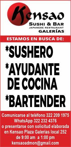 Estamos contratando, ayudante de cocina caliente, sushero, aux. de almacén y compras. Informes. 322 15 003-85, 322 22