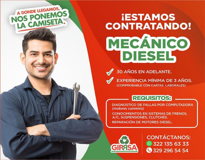 Estamos contratando mecánico diésel, con experiencia mínima de 3 años. Contáctanos. 322 13