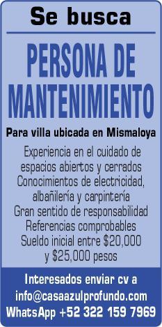 licitamos personal de Mantenimiento con disponibilidad de horario, conocimiento en electricidad, fontanería y plomería, aires acondicionados y alberca. Enviar solicitud o currículum por WhatsApp al. 322 20 560-93.+