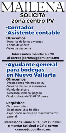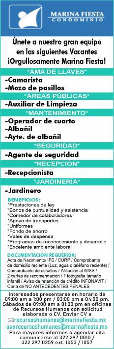 Área de Nuevo Vallarta, solicitamos ayudante de mantenimiento, aux. de almacén, steward, mesero. Presentar solicitud