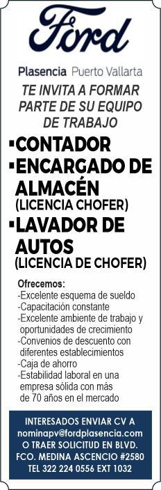 de manejo y motociclista, auxiliar de lavandería y limpieza. Envía solicitud por WhatsApp tel. 322 21 677-22.+