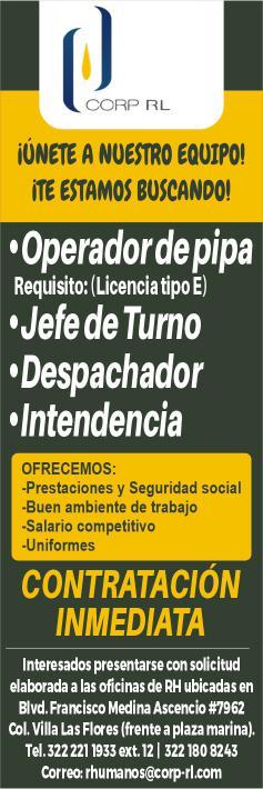 Estamos buscando personal operador de pipa, jefe de turno, intendencia. Contratación inmediata. Tel. 322 22 119-33.+