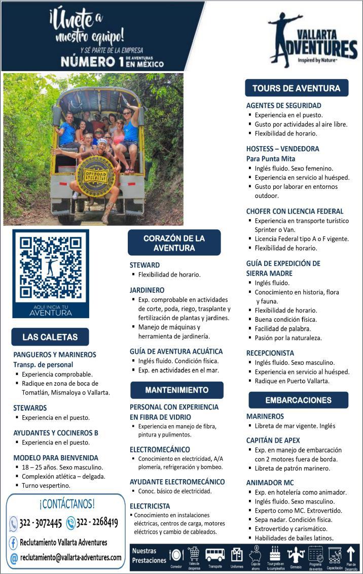 Buscamos para área Quimixto el siguiente personal: Agente de Seguridad, Panguero, Marinero, Steward, Operador de Cuartos, Camarista, contacta vía WhatsApp al. 322 24 41054.+