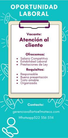 solicitamos asesor de ventas, agente de seguridad, auxiliar de limpieza. Pide cita al tel. 322 21 666-26.+