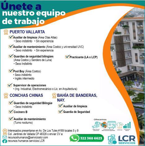 Estamos solicitando en diferentes áreas Administrativas, Operativas y de Servicios, muchas vacantes. Interesados acudir a Av. de Los Tules N.169 Col. Jardines Vallarta.