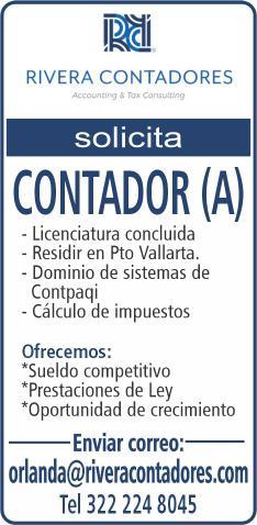 Solicita contador (a), licenciatura concluida y vivir en Puerto Vallarta. Llamar al tel. 331 06 360-65.+