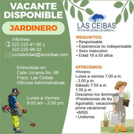 Solicitamos Jardinero, Palapero y Aux. de supervidor de obra Jardinería. Interesados presentarse con solicitud elaborada en Carr. Ixtapa 1179, col. Las Juntas. Tel. 322 29 034-64, 322