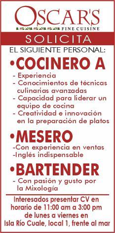 Se solicita cajera con inglés básico, conocimiento en open table, cocinero B y ayudante de
