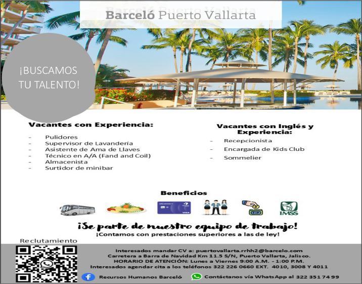 Hotel en Conchas Chinas solicita Ayudante de Mesero, Cocinero Nocturno, Steward, Ayudante de Panadero, Recepcionistas, Operador de Mantenimiento. Informes al. 322 22 155-56.+