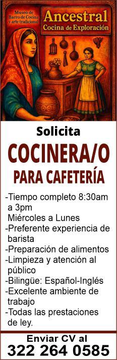 Se solicita cocinera (o) para cafetería. Enviar CV al. 322 26 405-85.+
