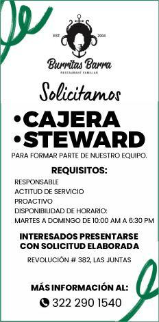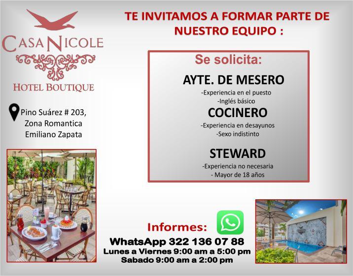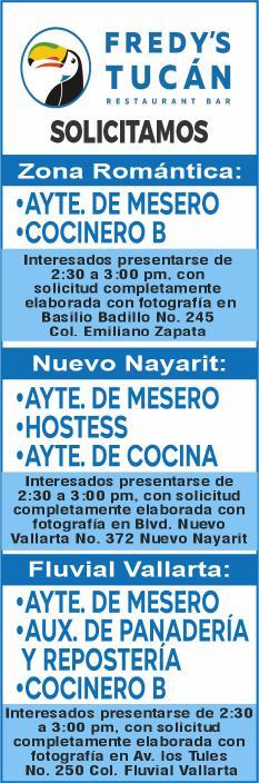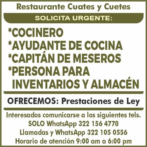 Se solicitan urgentes meseros, ayudantes de meseros, ayte. de bar, ayte. de cocina, cocinero, solo llamadas de 9:00 am a 6:00 pm, no mensajes al. 322