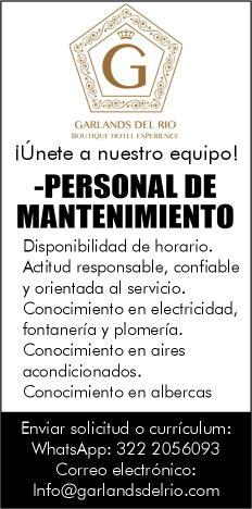 ¡Únete a nuestro equipo! Solicitamos personal de Mantenimiento con disponibilidad de horario, conocimiento en electricidad, fontanería y plomería, aires acondicionados y alberca. Enviar solicitud o currículum por WhatsApp al. 322 20 56093.+
