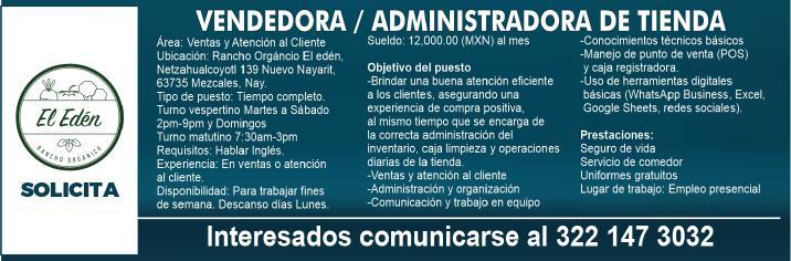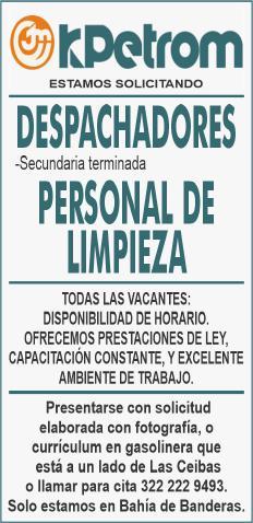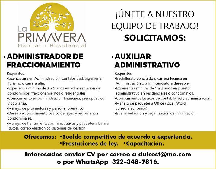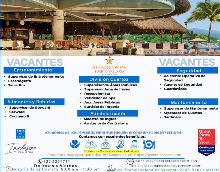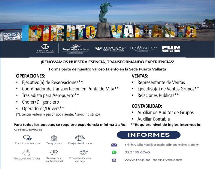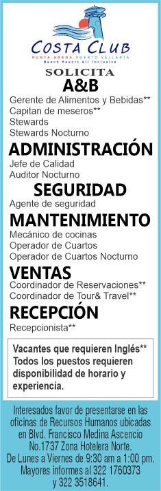 tes áreas Administrativas, Operativas y de Servicios, muchas vacantes. Interesados acudir a Av. de Los Tules N.169 Col. Jardines Vallarta.