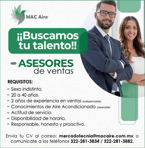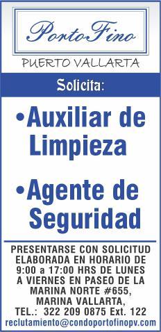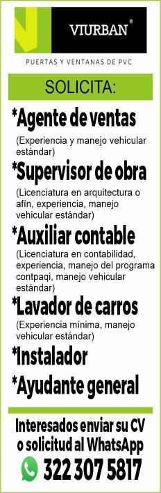 solicitamos asesor de ventas, agente de seguridad, auxiliar de limpieza. Pide cita al tel. 322 21 666-26.+