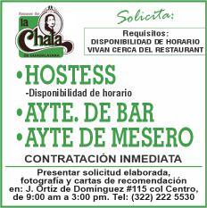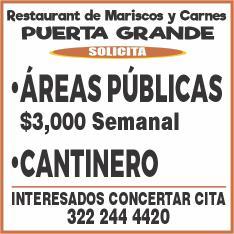 Buscamos cocineros B con experiencia, hostess con buena presentación, mesero con disponibilidad de horario. Inf. 322 22 309-28, 322 22 309-29.+